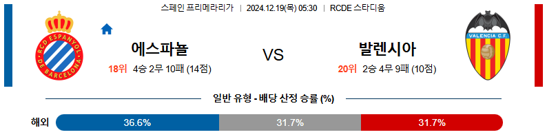 에스파뇰 대 발렌시아 라리가 12월19일 맞대결 생중계, 스포츠중계, 스포츠분석