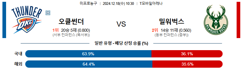 오클라호마시티 대 밀워키 NBA 12월18일 맞대결 생중계, 스포츠중계, 스포츠분석