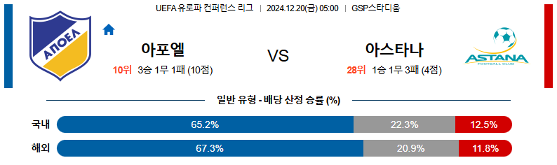아포엘 대 아스타나 UEFA컨퍼런스리그 12월20일 맞대결 생중계, 스포츠중계, 스포츠분석