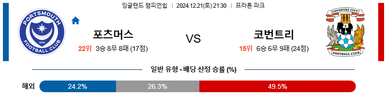 포츠머스 대 코번트리시티 챔피언쉽 12월21일 맞대결 생중계, 스포츠중계, 스포츠분석