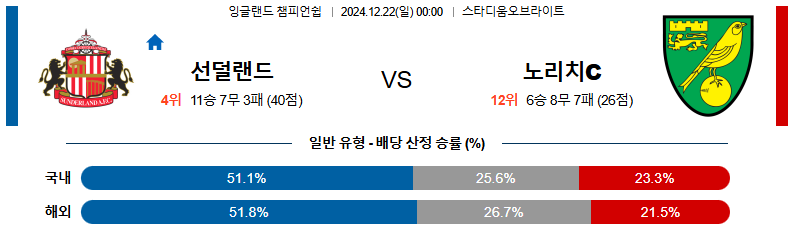 선덜랜드 대 노리치시티 잉글랜드챔피언쉽 12월22일 맞대결 생중계, 스포츠중계, 스포츠분석