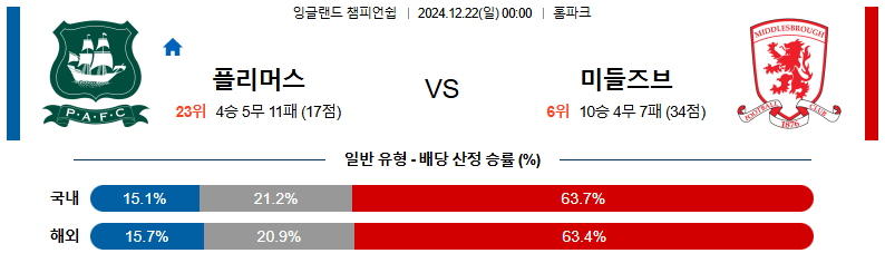 플리머스 대 미들즈브러 잉글랜드챔피언쉽 12월22일 맞대결 생중계, 스포츠중계, 스포츠분석