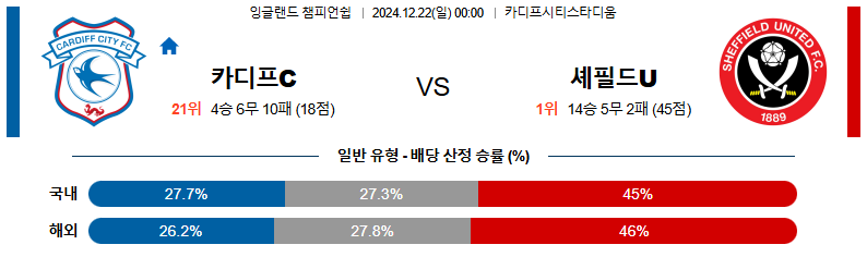 카디프시티 대 셰필드UTD 잉글랜드챔피언쉽 12월22일 맞대결 생중계, 스포츠중계, 스포츠분석