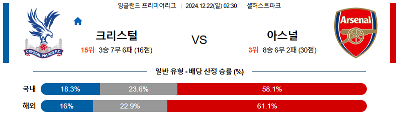 팰리스 대 아스날 EPL 12월22일 맞대결 생중계, 스포츠중계, 스포츠분석