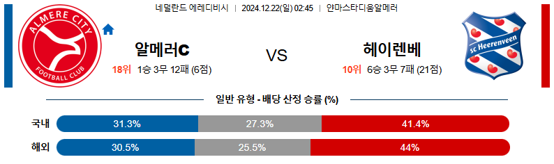 알메러시티 대 헤렌벤 에레디비지에 12월22일 맞대결 생중계, 스포츠중계, 스포츠분석