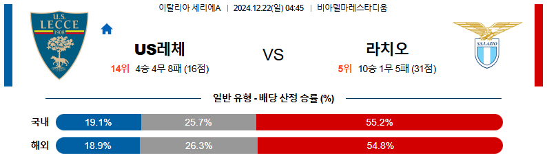 레체 대 라치오 세리에A 12월22일 맞대결 생중계, 스포츠중계, 스포츠분석