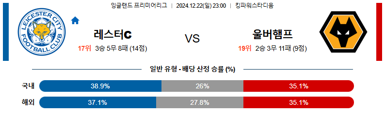 레스터시티 대 울버햄튼 EPL 12월22일 맞대결 생중계, 스포츠중계, 스포츠분석