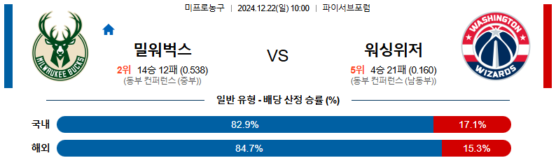 밀워키 대 워싱턴 NBA 12월22일 맞대결 생중계, 스포츠중계, 스포츠분석