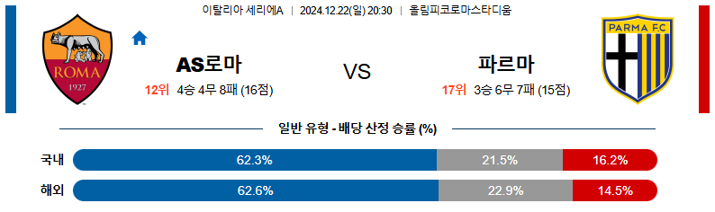 AS로마 대 파르마 세리에A 12월22일 맞대결 생중계, 스포츠중계, 스포츠분석