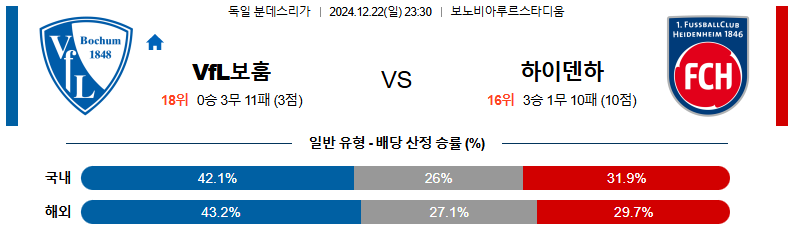 보훔 대 하이덴하임 분데스리가 12월22일 맞대결 생중계, 스포츠중계, 스포츠분석