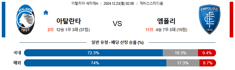아탈란타 대 엠폴리 세리에A 12월23일 맞대결 생중계, 스포츠중계, 스포츠분석