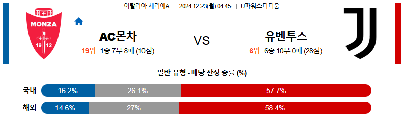 몬차 대 유벤투스 세리에A 12월23일 맞대결 생중계, 스포츠중계, 스포츠분석