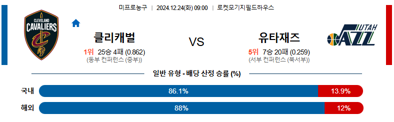 클리블랜드 대 유타 NBA 12월24일 맞대결 생중계, 스포츠중계, 스포츠분석