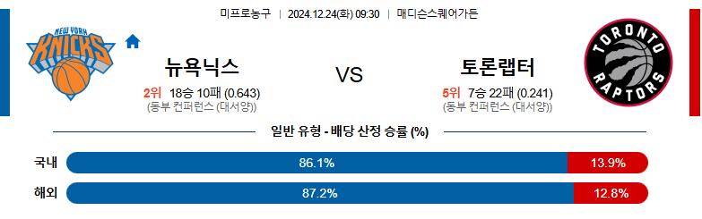 뉴욕닉스 대 토론토 NBA 12월24일 맞대결 생중계, 스포츠중계, 스포츠분석