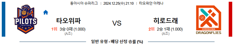 타오위안파우이안파일럿츠 대 히로시마드래곤플라이스 동아시아슈퍼리그(남) 12월25일 맞대결 생중계, 스포츠중계, 스포츠분석