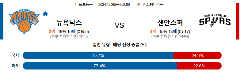 뉴욕닉스 대 샌안토니오 NBA 12월26일 맞대결 생중계, 스포츠중계, 스포츠분석