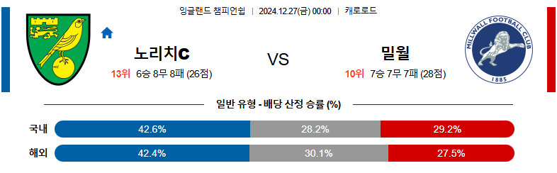 노리치시티 대 밀월 챔피언쉽 12월27일 맞대결 생중계, 스포츠중계, 스포츠분석