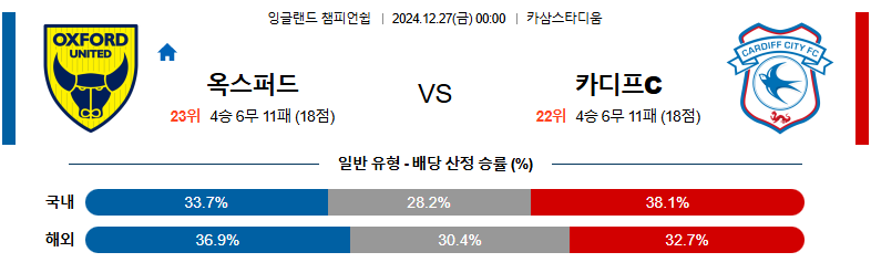 옥스퍼드 대 카디프시티 챔피언쉽 12월27일 맞대결 생중계, 스포츠중계, 스포츠분석