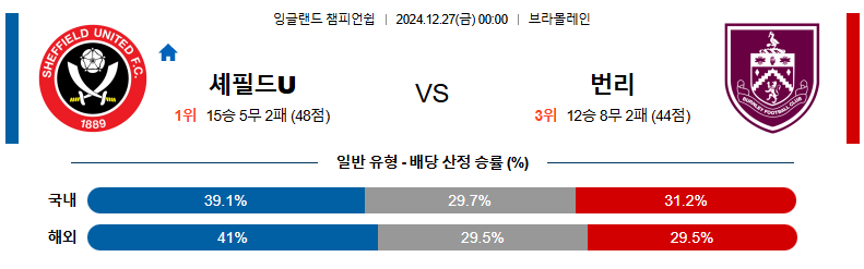 셰필드UTD 대 번리 챔피언쉽 12월27일 맞대결 생중계, 스포츠중계, 스포츠분석