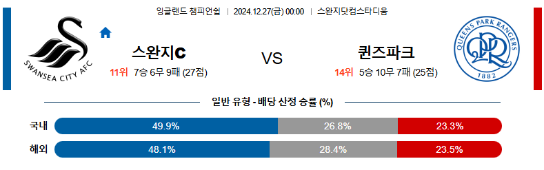 스완지시티 대 QPR 챔피언쉽 12월27일 맞대결 생중계, 스포츠중계, 스포츠분석