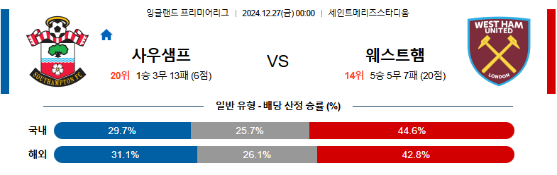 사우샘프턴 대 웨스트햄 EPL 12월27일 맞대결 생중계, 스포츠중계, 스포츠분석