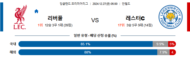 리버풀은 홈 경기의 이점과 강력한 공격력으로 경기를 주도할 가능성이 높습니다. 레스터는 수비적으로 나설 것이지만, 리버풀의 압박을 막아내기는 쉽지 않을 것입니다. 다득점 경기가 예상되며, 리버풀의 3~4골 차 승리가 유력할 것으로 보입니다.