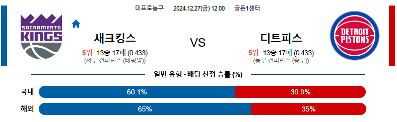 새크라멘토 대 디트로이트 NBA 12월27일 맞대결 생중계, 스포츠중계, 스포츠분석