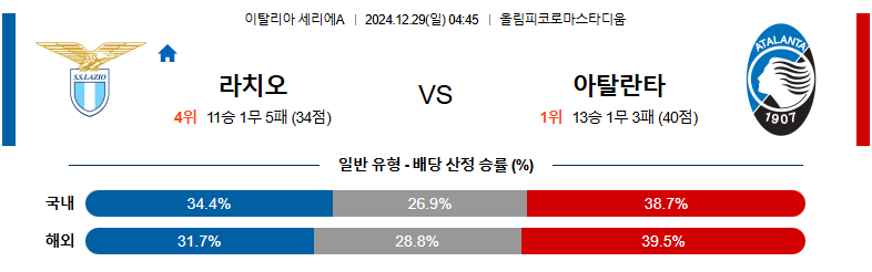 라치오 대 아탈란타 세리에A 12월29일 맞대결 생중계, 스포츠중계, 스포츠분석