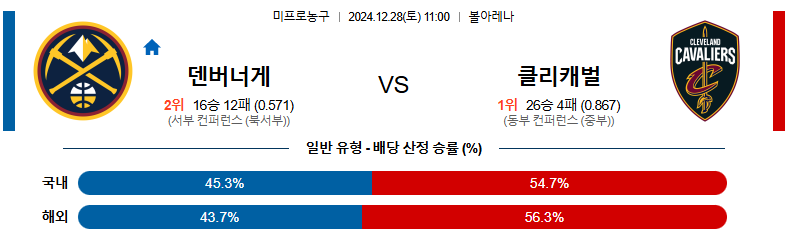 덴버 대 클리블랜드 NBA 12월28일 맞대결 생중계, 스포츠중계, 스포츠분석