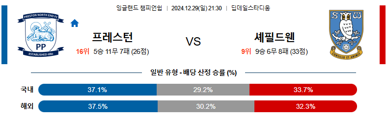 프레스턴 대 셰필드WED 챔피언쉽 12월29일 맞대결 생중계, 스포츠중계, 스포츠분석
