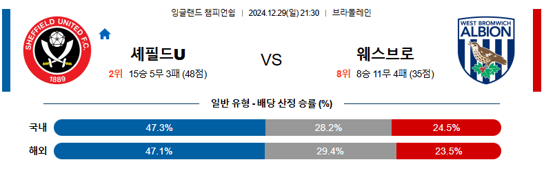 셰필드UTD 대 웨스트브롬 챔피언쉽 12월29일 맞대결 생중계, 스포츠중계, 스포츠분석