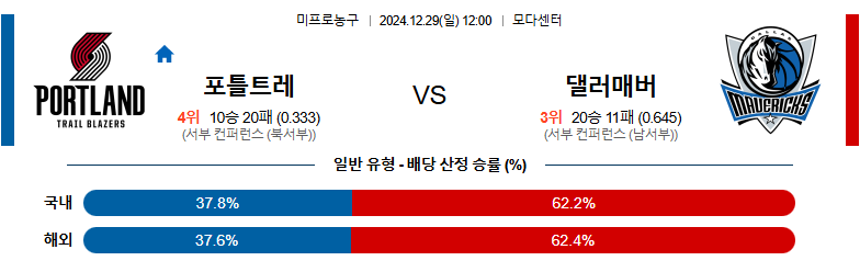 댈러스는 돈치치가 부상으로 결장할 가능성이 있고, 백투백 원정이라는 점에서 이점을 잃을 수 있습니다. 포틀랜드는 홈에서 2연승을 기록하면서 공격적인 농구로 승리의 해법을 찾아냈다는 점을 잊지 말아야 합니다.