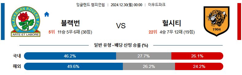 블랙번 대 헐시티 챔피언쉽 12월30일 맞대결 생중계, 스포츠중계, 스포츠분석
