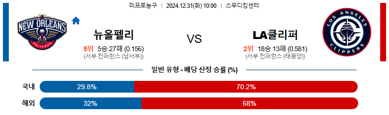 뉴올리언스 대 LA클리퍼스 NBA 12월31일 맞대결 생중계, 스포츠중계, 스포츠분석