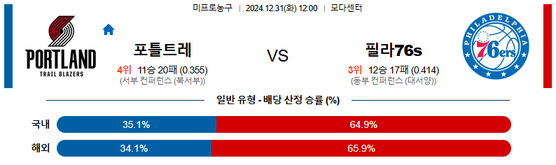 포틀랜드 대 필라델피아 NBA 12월31일 맞대결 생중계, 스포츠중계, 스포츠분석