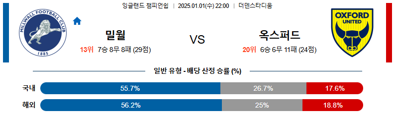 밀월 대 옥스퍼드 잉글랜드챔피언쉽 01월01일 맞대결 생중계, 스포츠중계, 스포츠분석