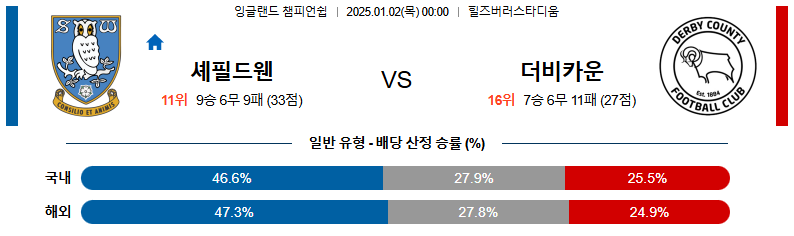 셰필드WED 대 더비카운티 잉글랜드챔피언쉽 01월02일 맞대결 생중계, 스포츠중계, 스포츠분석