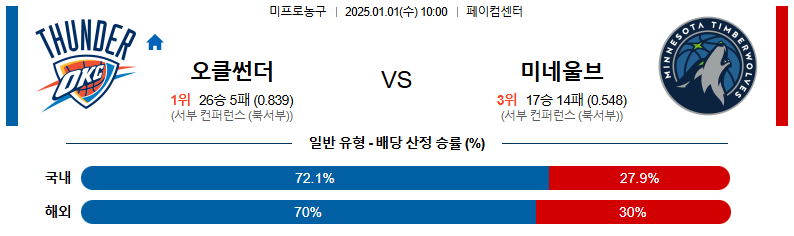 오클라호마시티 대 미네소타 NBA 01월01일 맞대결 생중계, 스포츠중계, 스포츠분석