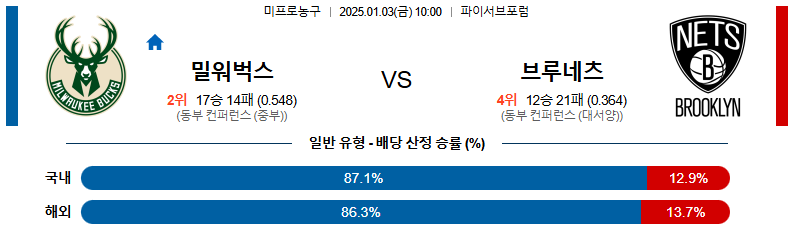 밀워키 대 브루클린 NBA 01월03일 맞대결 생중계, 스포츠중계, 스포츠분석