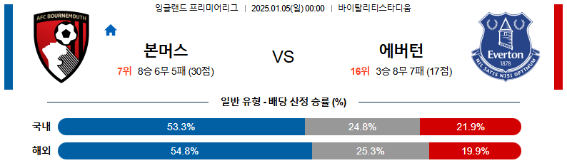 본머스 대 에버튼 EPL 01월05일 맞대결 생중계, 스포츠중계, 스포츠분석