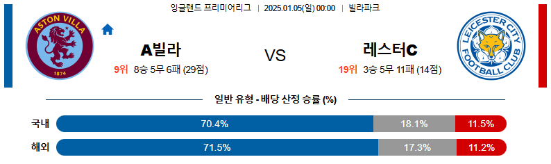 아스톤빌라 대 레스터시티 EPL 01월05일 맞대결 생중계, 스포츠중계, 스포츠분석