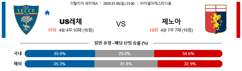 레체 대 제노아 세리에A 01월05일 맞대결 생중계, 스포츠중계, 스포츠분석