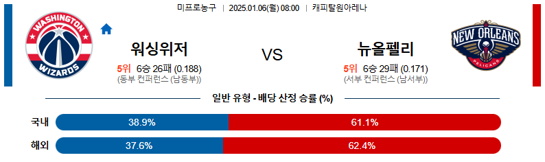 워싱턴 대 뉴올리언스 NBA 01월06일 맞대결 생중계, 스포츠중계, 스포츠분석