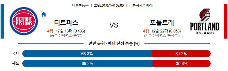 디트로이트 대 포틀랜드 NBA 01월07일 맞대결 생중계, 스포츠중계, 스포츠분석