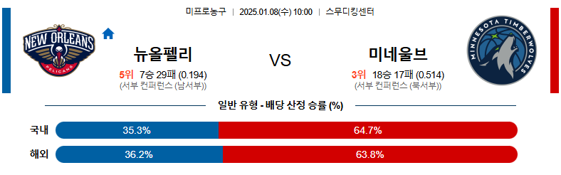 뉴올리언스 대 미네소타 NBA 01월08일 맞대결 생중계, 스포츠중계, 스포츠분석