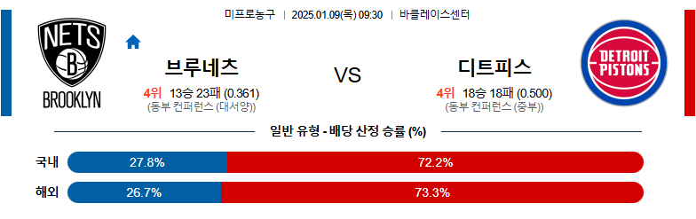 브루클린 대 디트로이트 NBA 01월09일 맞대결 생중계, 스포츠중계, 스포츠분석