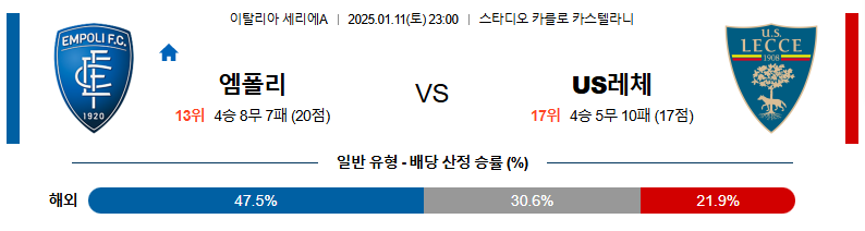 엠폴리 대 레체 세리에A 01월11일 맞대결 생중계, 스포츠중계, 스포츠분석