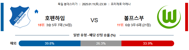 호펜하임 대 볼프스 분데스리가 01월11일 맞대결 생중계, 스포츠중계, 스포츠분석