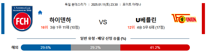 하이덴하임 대 우니온베를린 분데스리가 01월11일 맞대결 생중계, 스포츠중계, 스포츠분석