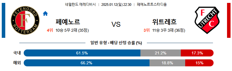 페예노르트 대 위트레흐트 에레디비시 01월12일 맞대결 생중계, 스포츠중계, 스포츠분석
